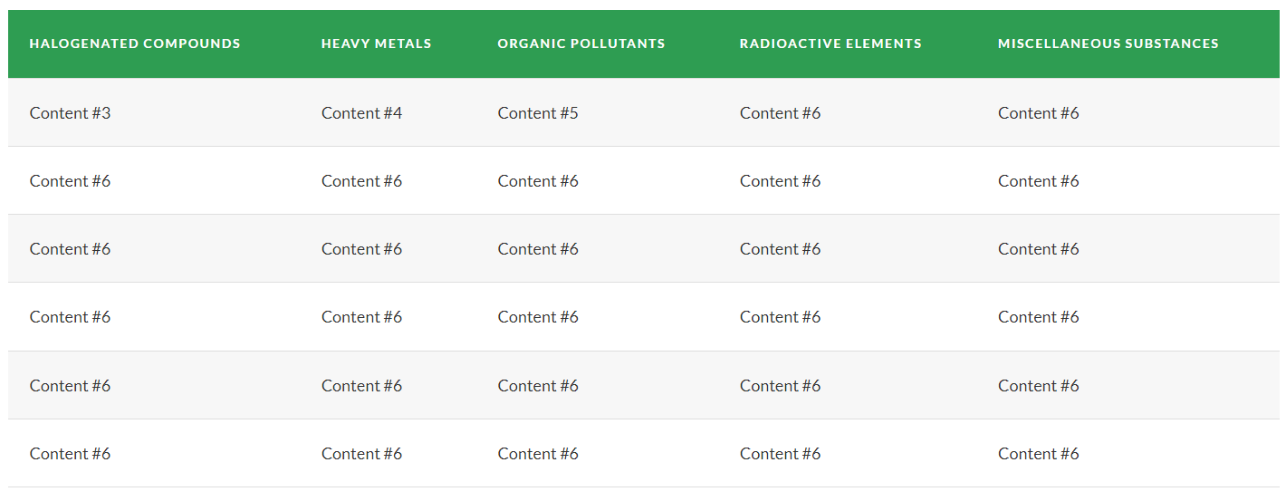 | Halogenated Compounds | Heavy Metals | Organic Pollutants | Radioactive Elements | Miscellaneous Substances |